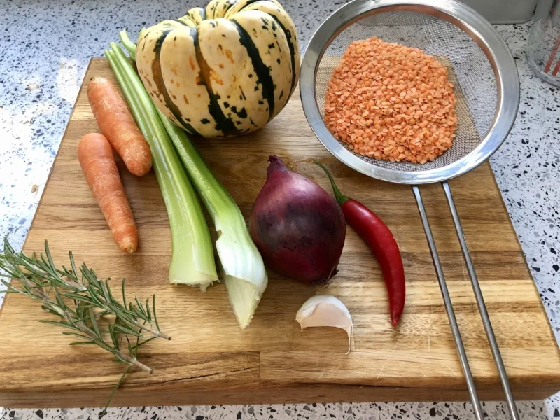 Add onion, carrots, celery, garlic, squash, rosemary leaves and chilli and on low heat, ‘sweat’ the veg with lid on, stirring now and then, for 15-20 mins until veg soft